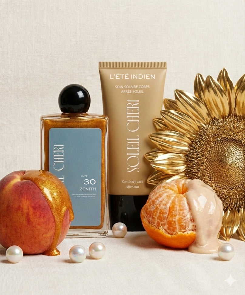 - Diffuse un parfum sensuel inspiré d'un ciel fleuri, signature Soleil Chéri®, imaginé comme une aura chaude autour du corps.